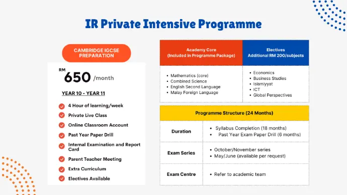 - Mathematics, Science, English, Bahasa Melayu, Sejarah, Pendidikan Islam/Moral +(electives available)